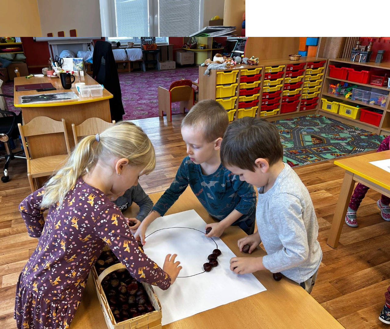 V našem oddělení se zaměřujeme na  rozvoj dítěte po stránce fyzické, ale i  rozumové. Pracujeme s enviromentální výchovou, která dětem nejvíce přibližuje svět ve kterém žijí. Pracujeme nejvíce z materiálu, který je recyklovatelný a děti s ním rádi tvoří, protože si z něj mohou tvořit i doma. Snažíme se rozvíjet dětskou fantazii a pomocí rozvíjení poznatků o přírodě je k ní co nejvíce přiblížit. Využíváme interaktivní tabuli, na které práce  děti velice baví a můžeme dětem pouštět hudbu či pohádky. Vše se děti učí hravou formou, která je učí ohleduplnosti k ostatním dětem a dospělým, ale také k místu, kde žijí.